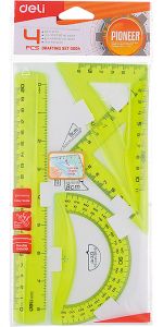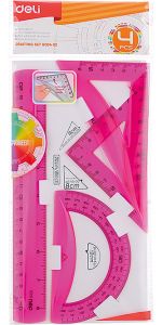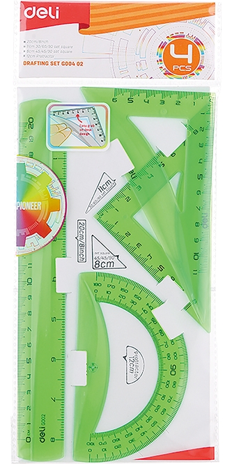 • 4 komada: ravnalo od 20 cm, kvadrat 45°45°, kvadrat 60°90°, polukrug 180°