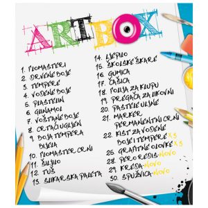 • set sadrži: grafitne olovke, drvene boje, flomastere, voštane boje, vodene boje, tempere, paletu, kistove, glinamol, plastelin, ugljen, crni tuš