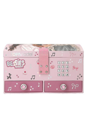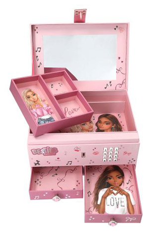 Za nakit ili mala blaga i tajne: Ružičasta TOPModel kutija za nakit otvara se samo kada se unese ispravan 4-znamenkasti kod (osobno podesiv/promjenjiv). Zatim se nova TOPModel pjesma BEST FRIENDS reproducira otprilike 20 sekundi. S lijepim motivima modela i slatkim malim ikonama izvana i iznutra. Glavni pretinac, uklonjivi uložak s tri pretinca i dvije ladice s nakitom kao kvakama koriste se za pohranu.