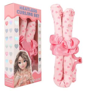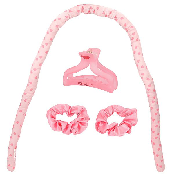 Set se sastoji od velike ružičaste papirnate papilote s printom srca, 1 ružičaste kopče za kosu sa srcem i dvije ružičaste gumice.